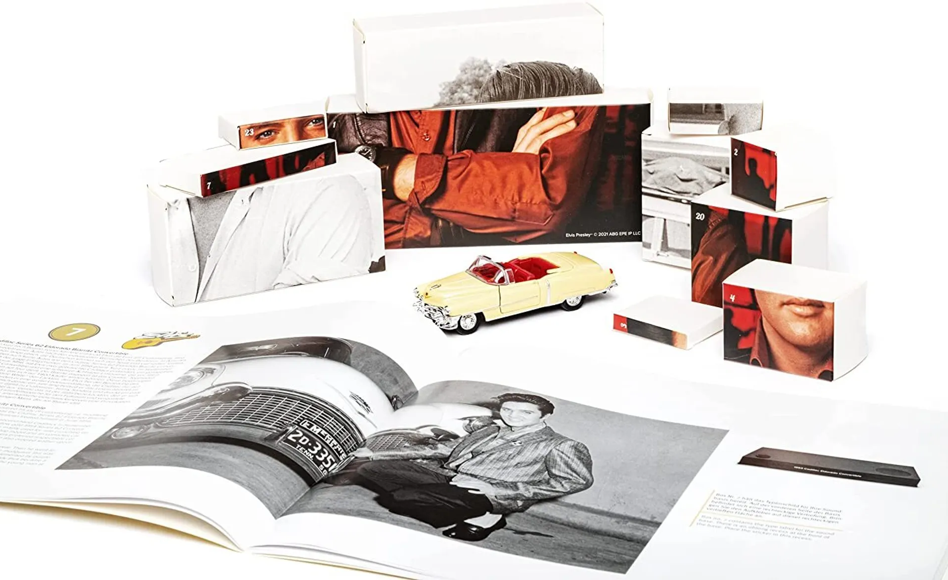 Kalendarz adwentowy z Elvisem Presleyem, wydany przez Franzis, to wyjątkowy zestaw dla fanów Króla Rock’n’Rolla. Oprócz miniaturowego modelu Cadillaca Eldorado z 1953 roku, kalendarz zawiera kolekcjonerskie skarby, które umilają 24 dni Adwentu. W stylowym opakowaniu znajduje się książka towarzysząca z bogatą wiedzą o życiu Elvisa oraz jego pojazdach, a także baza dźwiękowa, która po naciśnięciu przycisku odtwarza głos artysty. Zestaw oferuje różne niespodzianki do zbierania i dekorowania, a także szczegółowe instrukcje montażu. Wysoka jakość modelu i komponentów zapewnia niezawodność, a dołączone narzędzia sprawiają, że montaż jest prosty, bez potrzeby klejenia czy malowania. To kompletny pakiet dla prawdziwych miłośników Elvisa, który pozwala na stworzenie małego świata wspomnień związanych z jego życiem i twórczością.