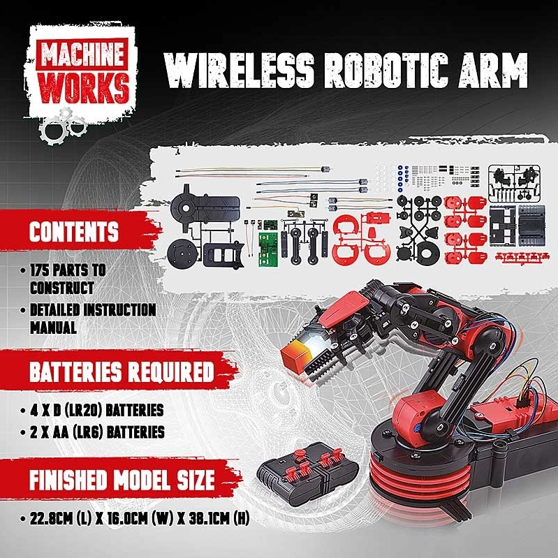 Bezprzewodowe ramię robota Machine Works to zwycięzca konkursu Dad’s Choice Awards 2023, które pozwala na zbudowanie własnego modelu robota. Zestaw zawiera 175 części oraz ilustrowane instrukcje krok po kroku, umożliwiające skonstruowanie działającego ramienia robota. Ramię charakteryzuje się szerokim zakresem ruchu dzięki pięciu silnikom napędzającym pięć stawów, co zapewnia optymalną kontrolę i zabawę. Po zakończeniu budowy, użytkownik może korzystać z unikalnego 5-kierunkowego kontrolera, który pozwala na obrót ramienia o 270 stopni oraz poruszanie w poziomie do 32 cm i w pionie do 38 cm. Robot wyposażony jest w chwytak z oświetleniem, zdolny do podnoszenia małych przedmiotów o wadze poniżej 100 g, co stanowi doskonałe wprowadzenie do podstaw robotyki.